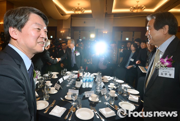 (서울=포커스뉴스) 4일 오후 서울 강남구 프리마호텔에서 전국호남향우회 정기총회에 참석한 김무성(오른쪽부터) 새누리당 대표, 김종인 더불어민주당 비대위 대표, 안철수 국민의당 상임공동대표가 내빈들과 인사하고 있다.