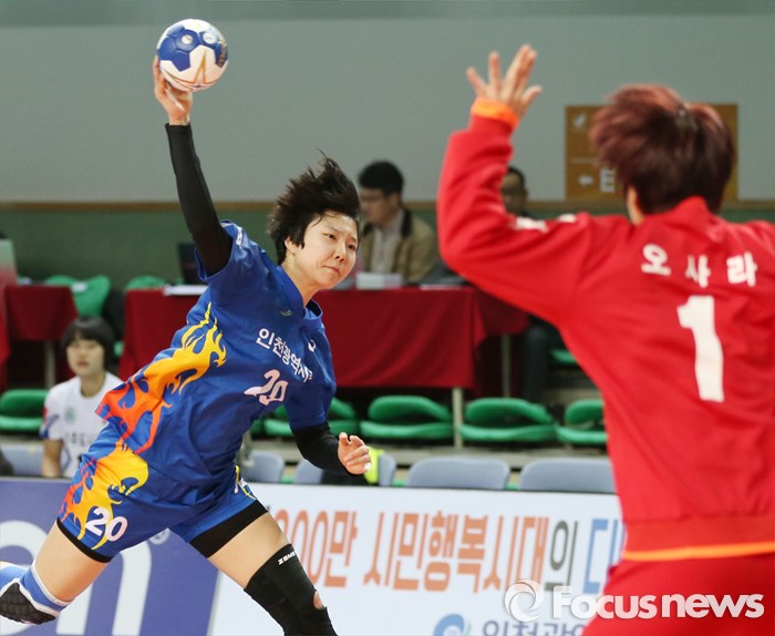 (인천=포커스뉴스) 4일 인천선학체육관에서 열린 2016 SK 핸드볼 코리아리그 여자부 인천시청-광주도시공사 경기에서 인천시청 송해리가 광주도시공사 골키퍼 오사라의 빈 곳을 향해 슈팅하고 있다.