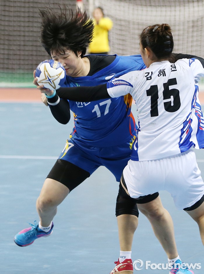 (인천=포커스뉴스) 4일 인천선학체육관에서 열린 2016 SK 핸드볼 코리아리그 여자부 인천시청-광주도시공사 경기에서 인천시청 김희진을 광주도시공사 김혜원이 팔을 잡으며 마크하고 있다.