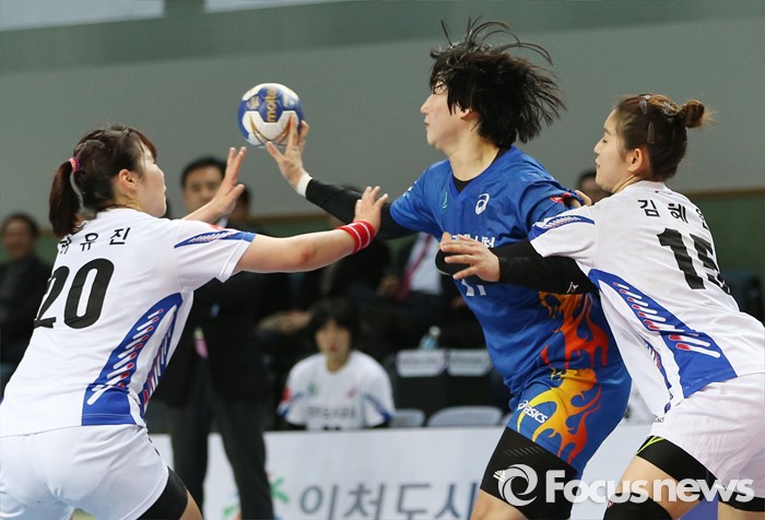 (인천=포커스뉴스) 4일 인천선학체육관에서 열린 2016 SK 핸드볼 코리아리그 여자부 인천시청-광주도시공사 경기에서 인천시청 김성은을 광주도시공사 허유진과 김혜원이 수비하고 있다.
