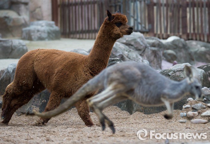 (서울=포커스뉴스) 5일 오전 서울 광진구 어린이대공원 동물원에서 알파카와 캥거루가 뛰고 있다. 이날 공개된 알파카는 낙타과의 포유류로 해발 4000m 이상인 남미 칠레, 페루, 볼리비아의 안데스 산맥 산악지대에 주로 서식한다.
