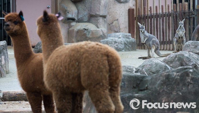 (서울=포커스뉴스) 5일 오전 서울 광진구 어린이대공원 동물원에서 캥거루들이 알파카를 보고 놀라고 있다. 이날 공개된 알파카는 낙타과의 포유류로 해발 4000m 이상인 남미 칠레, 페루, 볼리비아의 안데스 산맥 산악지대에 주로 서식한다.
