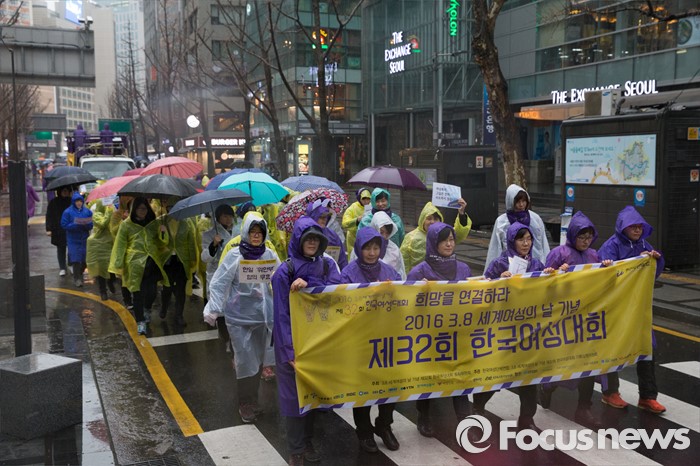 (서울=포커스뉴스) 5일 오후 세계여성의날(3월8일) 기념 제32회 한국여성대회를 마친 참가자들이 서울 종로구 일본대사관을 향해 행진하고 있다.