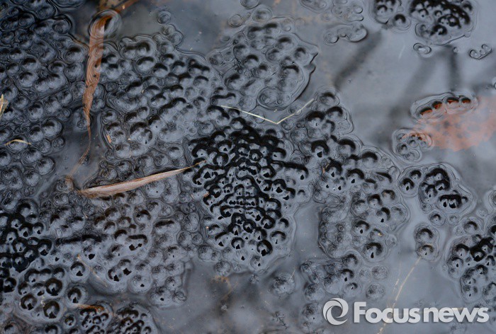 (영암=포커스뉴스) 전국적으로 봄비가 내리고 절기상경칩인 5일 전남 영암군 영암읍 월출산 자락에 겨울잠에서 깨어난 산개구리들이 산란한 알이 물에 잠긴 포도송이 같다. <사진제공=김현태 양서류연구가>
