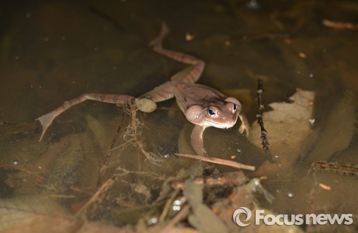 (영암=포커스뉴스) 전국적으로 봄비가 내리고 절기상경칩인 5일 전남 영암군 영암읍 월출산 자락에 겨울잠에서 깨어난 산개구리 수컷이 암컷을 찾는 노래를 하고 있다. <사진제공=김현태 양서류연구가>