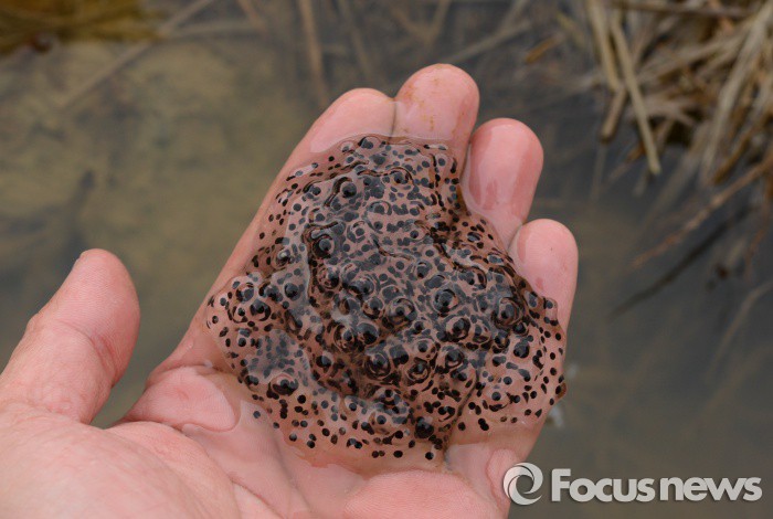 (영암=포커스뉴스) 전국적으로 봄비가 내리고 절기상경칩인 5일 전남 영암군 영암읍 월출산 자락의 계단논에 겨울잠에서 깨어난 산개구리들이 산란한 알이 뭉쳐 있다. <사진제공=김현태 양서류연구가>