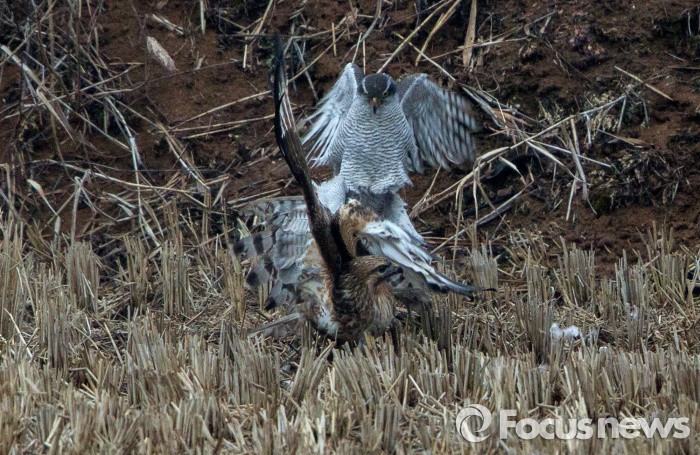 (철원=포커스뉴스) 북상길에 오른 멸종위기종 참매(뒷쪽 천연기념물 323호)가 자신의 먹잇감을 빼앗은 말똥가리를 뒤에서 기습하고 있다.