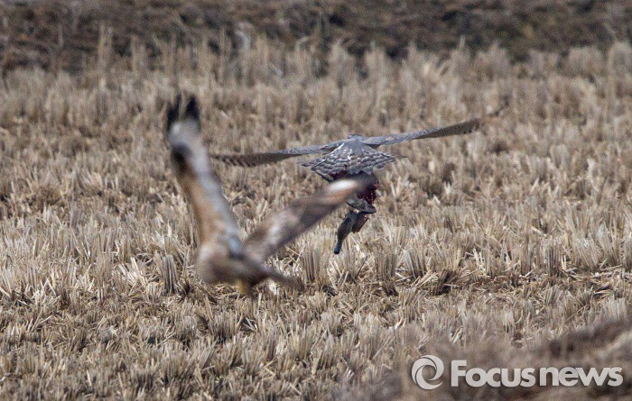 (철원=포커스뉴스)멸종위기종 참매(오른쪽 천연기념물 323호)가 자신이 사냥한 고방오리 암컷을말똥가리에게 빼앗겼다가 다시 탈환해 달아나고 말똥가리는 뒤쫒고 있다.