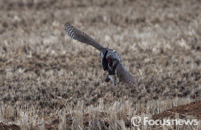 (철원=포커스뉴스)멸종위기종 참매(오른쪽 천연기념물 323호)가 자신이 사냥한 고방오리 암컷을말똥가리에게 빼앗겼다가 다시 탈환해 달아나고 있다.