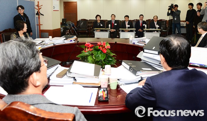 (서울=포커스뉴스) 6일 오전 서울 여의도 새누리당사에서 실시된 공천면접에 참석한 김무성 대표와 참석자들이 공천관리위원들의 질문을 받고 있다.