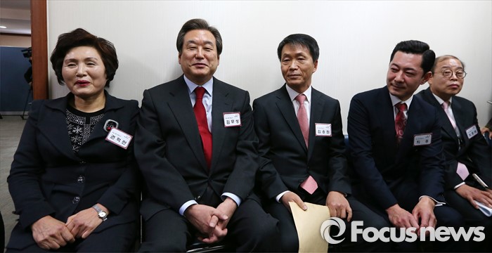(서울=포커스뉴스) 부산 중구·영도구에 출마하는 김무성 새누리당 대표가 6일 오전 서울 여의도 당사에 마련된 공천 심사 면접장 앞에서 예비후보들과 대기하고 있다.