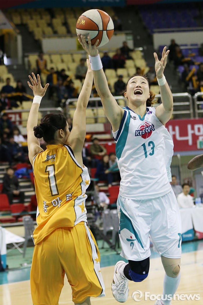 (부천=포커스뉴스) 6일 부천체육관에서 열린 2015-2016 여자프로농구 KEB하나은행-KB스타즈 경기에서 KEB하나 김정은이 KB스타즈 홍아란의 마크를 뚫으며 레이업슛을 시도하고 있다.