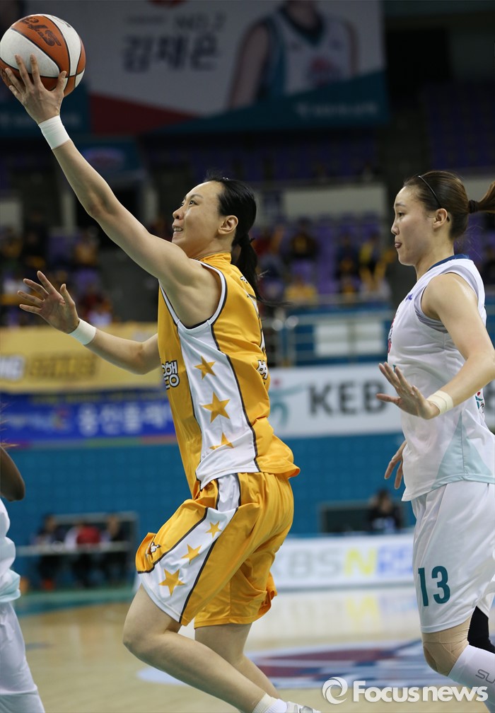 (부천=포커스뉴스) 6일 부천체육관에서 열린 2015-2016 여자프로농구 정규리그 마지막 경기 KEB하나은행-KB스타즈 경기에서 KB스타즈 변연하가 KEB하나 김정은을 제치며 레이업슛을 쏘고 있다.