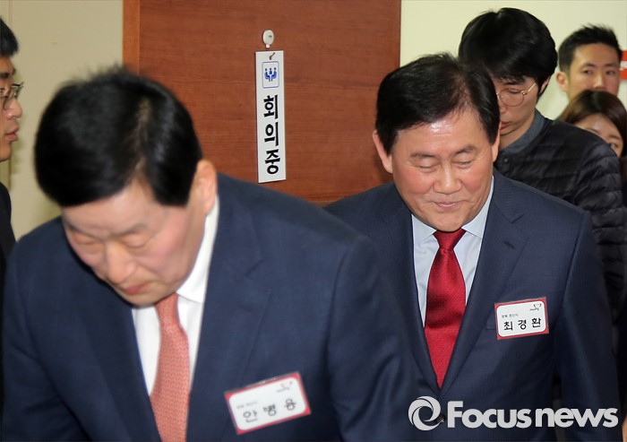 (서울=포커스뉴스) 새누리당 최경환 의원(오른쪽)이 6일 오후 서울 여의도 당사에서 열린 경북 경산 공천면접에 안병용 예비후보와 함께 참석하고 있다.