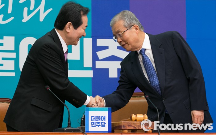 (서울=포커스뉴스) 김종인(오른쪽) 더불어민주당 비대위 대표와 정세균 유능한경제정당위원회 공동위원장이 7일 오전 서울 여의도 국회에서 비상대책위원회의에 앞서 열린 더불어성장 핸드북 발간 행사에 참석해 인사하고 있다.