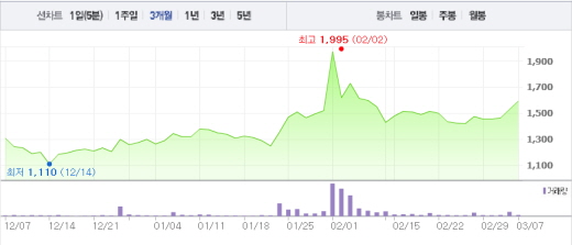 2월 큰 폭의 상승세를 기록했던 유니더스는 지지부진한 모습을 보여주고 있다. 유니더스는 0.93%(100원) 오른 1만850원에 거래 중이다. 유니더스는 2월 26일 거래제한폭인 30%나 상승하는 모습을 보여 왔지만 이후 큰 폭의 상승세는 나타내지 못했다.