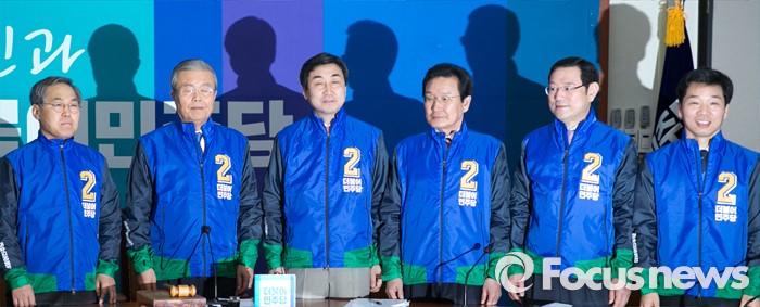 (서울=포커스뉴스) 김종인 더불어민주당 비대위 대표와 비대위원들이 7일 오전 서울 여의도 국회에서 비상대책위원회의에 앞서 20대 총선용 유니폼을 입고 취재진을 향해 포즈를 취하고 있다. 왼쪽부터 우윤근 비대위원, 김 대표, 이종걸 원내대표, 변재일, 이용섭, 김병관 비대위원.
