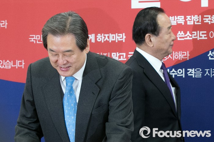 (서울=포커스뉴스) 김무성(왼쪽) 새누리당 대표가 7일 오전 서울 여의도 국회에서 열린 최고위원회의에 참석해 자리에 앉는동안, 서청원 최고위원이 김 대표 옆을 지나고 있다.