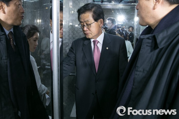 (서울=포커스뉴스) 공천 탈락 통보를 받은 김태환 새누리당 의원이 7일 오전 서울 여의도 국회에서 열린 최고위원회의에 참석한 뒤, 기자들의 질문을 들으며 승강기에 오르고 있다.