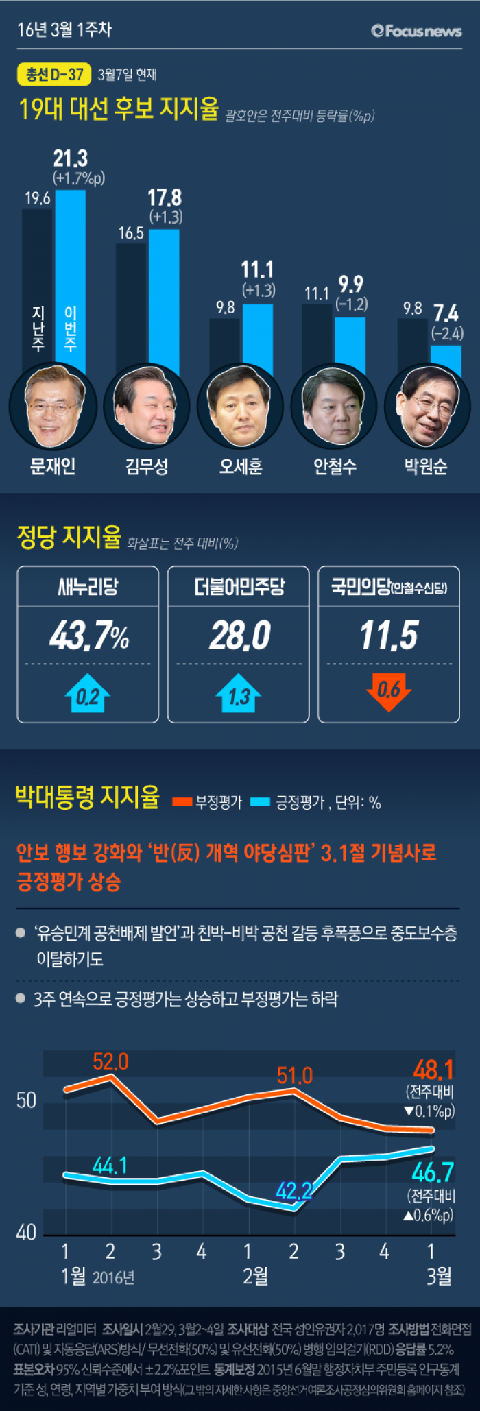 이번 주간집계는 2016년 2월 29일과 3월 2일부터 4일까지 4일간(3.1절 당일 제외) 전국 19세 이상 유권자 2,017명을 대상으로 전화면접(CATI) 및 자동응답(ARS) 방식으로 무선전화(60%)와 유선전화(40%) 병행 임의걸기(RDD) 방법으로 조사했고, 응답률은 5.2%이다. 통계보정은 2015년 12월말 행정자치부 주민등록 인구통계 기준 성, 연령, 권역별 가중치 부여 방식으로 이루어졌고, 표집오차는 95% 신뢰수준에서 ±2.2%p이다. 일간집계는 ‘2일 이동 시계열(two-day rolling time-series)’ 방식으로 2월 29일 1,007명, 3월 2일 1,008명, 3일 1,010명, 4일 1,009명을 대상으로 실시했고, 응답률은 2월 29일 5.6%, 3월 2일 5.1%, 3일 5.0%, 4일 5.3%, 표집오차는 4일간 모두 95% 신뢰수준에서 각각 ±3.1%p이다. 일간집계의 통계보정 방식은 주간집계와 동일하다. (그 밖의 자세한 사항은 중앙 선거 여론조사 공정 심의위원회 홈페이지 참조)