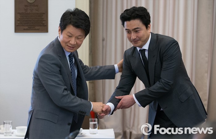 (서울=포커스뉴스) 7일 오전 서울 중구 프레스센터에서 2017 피파 20세 월드컵조직위원회 창립총회에 참석한 정몽규(왼쪽) 대한축구협회장과 안정환 해설위원이 인사를 하고 있다.