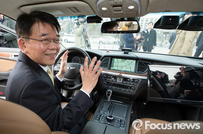 (세종=포커스뉴스) 7일 오전 세종시 정부세종청사 국토교통부 앞에서제1호 자율주행차 시험운행 허가 및 시연이 열린 가운데 현대 제네시스가 국내 자율주행차 임시운행 제1호차로 허가받고 도로주행을 시작했다. 강호인 국토교통부장관이 시범운행차량을 시승하고 있다.