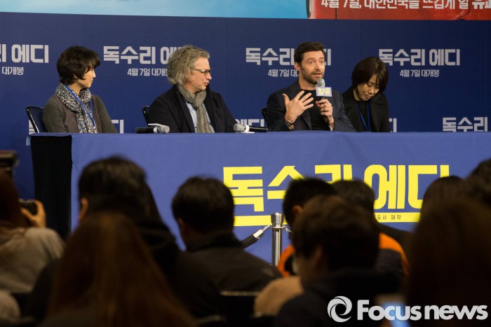 이들은 7일 오후 6시50분 여의도 IFC몰 CGV 광장 앞에서 레드카펫 행사에 참석한다. 8일에는 CGV영등포 스타리움관에서 '독수리 에디' 상영 뒤 관객과의 대화에 임한다.<서울=포커스뉴스> 배우 휴 잭맨(왼쪽에서 세번째)이 7일 서울 종로구 포시즌스호텔 서울에서 열린 영화 '독수리 에디' 기자간담회에 취재진 질문에 답하고 있다. 2016. 03.07 허란
