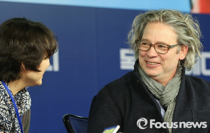 (서울=포커스뉴스) 7일 오전 서울 종로구 포시즌스 호텔 서울에서 열린 영화 '독수리 에디' 기자간담회에 참석한 영화감독 덱스터 플레처(오른쪽)가 통역사와 인사를 나누고 있다.