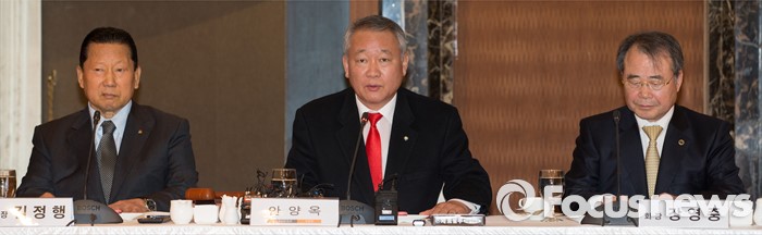 (서울=포커스뉴스) 7일 서울 중구 롯데호텔앤리조트 서울에서 열린 '대한체육회(통합체육회) 발기인 대회'에서 안양옥(가운데) 체육단체 통합준비위원장이 인사말을 하고 있다.