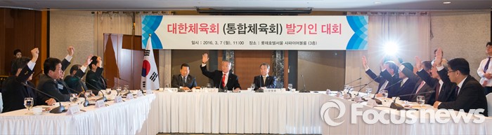 (서울=포커스뉴스) 7일 서울 중구 롯데호텔앤리조트 서울에서 열린 '대한체육회(통합체육회) 발기인 대회'에서 안양옥(오른쪽 일곱번째) 체육단체 통합준비위원장을 비롯한 위원들이 거수로 안건에 대한 표결을 하고 있다