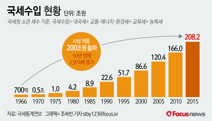 (서울=포커스뉴스) 7일 통계청이 발표한 '통계로 보는 국세청 50년'을 보면 1966년 국세청 개청 당시 700억원에 불과했던 국세수입(국세청 소관 세수)은 2015년 208조2000억원으로 사상 처음 200조원을 넘어섰다.