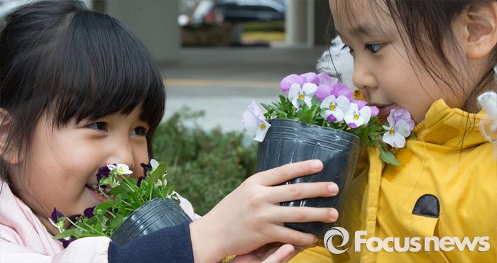(세종=포커스뉴스) 7일 오후 세종시 정부세종청사 농림축산식품부 앞 다솜동산에서 어린이가 팬지의 향기를 맡고 있다.