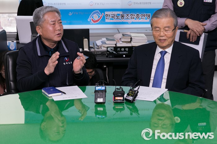 (서울=포커스뉴스) 김종인(오른쪽) 더불어민주당 비대위 대표가 7일 오후 서울 영등포구 한국노동조합총연맹을 방문해 김동만 위원장과 대화하고 있다.