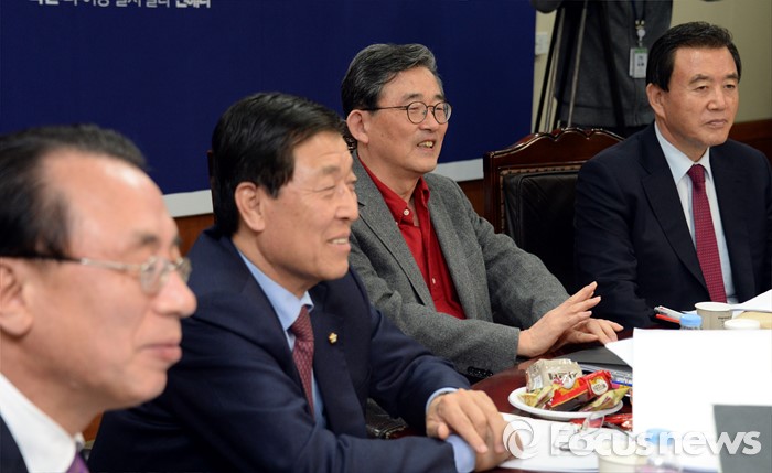 (서울=포커스뉴스) 새누리당 이한구(왼쪽에서 두번째) 공천관리위원장이 7일 오후 서울 여의도 당사에서 열린 20대 총선 선거구 획정과정에 분구·통합된 경기·충청·강원지역의 공천신청자면접에서 화성갑 서청원, 리은경 예비후보에게 질문을 하고 있다.