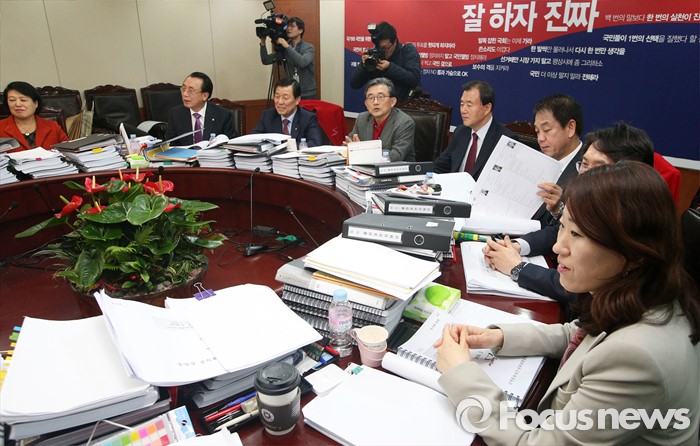 (서울=포커스뉴스) 이한구 새누리당 공천관리위원장이 7일 오후 서울 여의도 당사에서 열린 공천 면접에서 서청원(경기 화성갑) 최고위원에게 질문하고 있다.