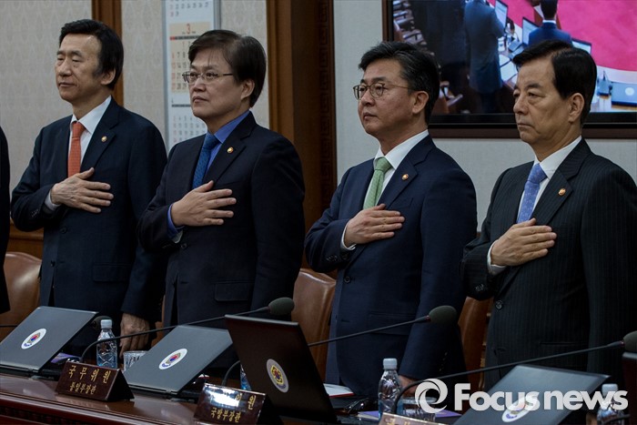 (서울=포커스뉴스) 8일 오전 서울 종로구 정부서울청사에서 열린 국무회의에서 윤병세(맨 왼쪽부터) 외교부 장관, 최양희 미래창조과학부 장관, 홍용표 통일부 장관, 한민구 국방부 장관이 국민의례를 하고 있다.