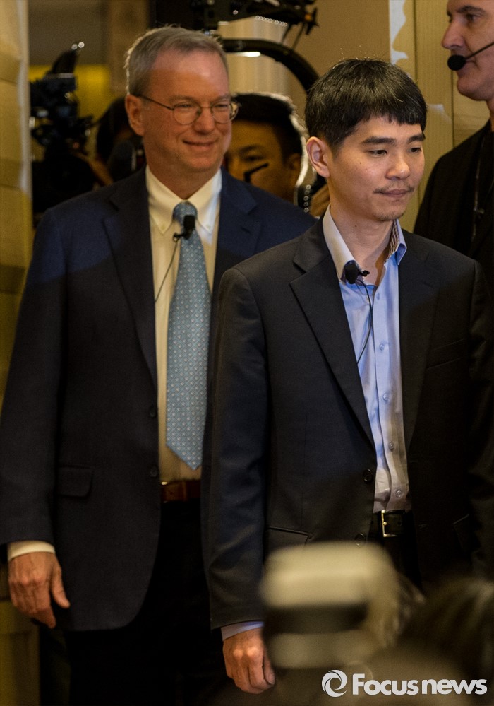 (서울=포커스뉴스) 8일 오전 서울 종로구 새문안로 포시즌스호텔에서 열린 '구글 딥마인드 챌린지 매치' 내ㆍ외신 합동 기자회견에 이세돌 9단, 에릭 슈미트(왼쪽) 구글 회장이 입장하고 있다.