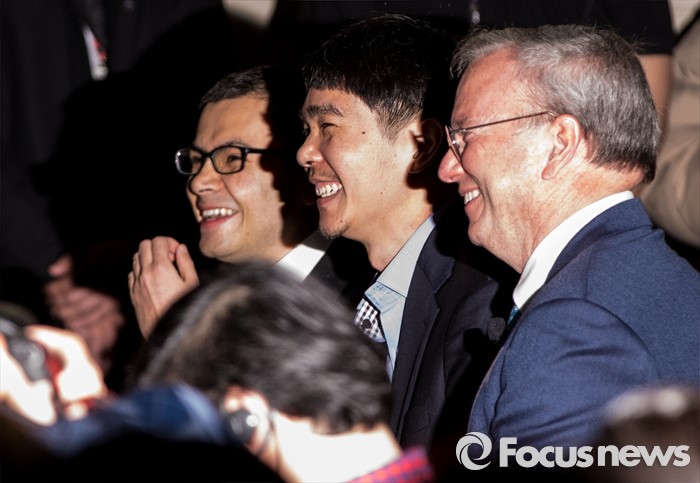 (서울=포커스뉴스) 8일 오전 서울 종로구 새문안로 포시즌스호텔에서 열린 '구글 딥마인드 챌린지 매치' 내ㆍ외신 합동 기자회견에 참석한 데미스 하사비스(왼쪽부터) 구글 딥마인드 최고경영자, 이세돌 9단, 에릭 슈미트 구글 회장이 밝게 웃고 있다.