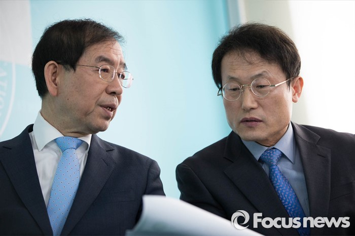 (서울=포커스뉴스) 박원순(왼쪽) 서울시장과 조희연 서울시교육감이 8일 오전 종로구 서울시교육청에서 열린 '서울시-교육청 교육협력사업 기자회견'에 참석해 대화하고 있다.