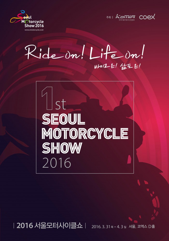 8일 서울모터사이클쇼 사무국에 따르면 이번 행사는 ‘Ride on Life on’이란 주제로 개최되며, 지난 2006년 대구국제모터사이클쇼 이후 10년만에 개최되는 국내 유일의 단독 모터사이클쇼이다.