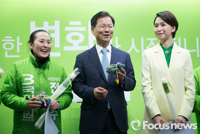 (서울=포커스뉴스) 국민의당 천정배 공동대표가 8일 오후 서울 마포구 국민의당 당사에서 여성 예비후보들에게 꽃을 선물한 후 여성 정책발표를 하고 있다.