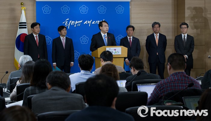 (서울=포커스뉴스) 8일 오후 서울 종로구 정부서울청사에서 이석준(왼쪽 세번째) 국무조정실장이 정부 독자 대북 제재안을 발표하고 있다.