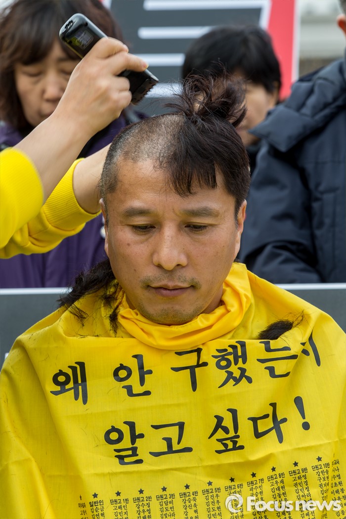 (서울=포커스뉴스) 8일 오후 서울 영등포구 국회 앞에서 열린 '19대 국회 세월호 특별법 개정안 특검 처리 촉구 기자회견'에 참석한 4.16가족협의회 관계자들이 정부에 세월호 참사 특검처리 약속 이행을 촉구하며 삭발 하고 있다.