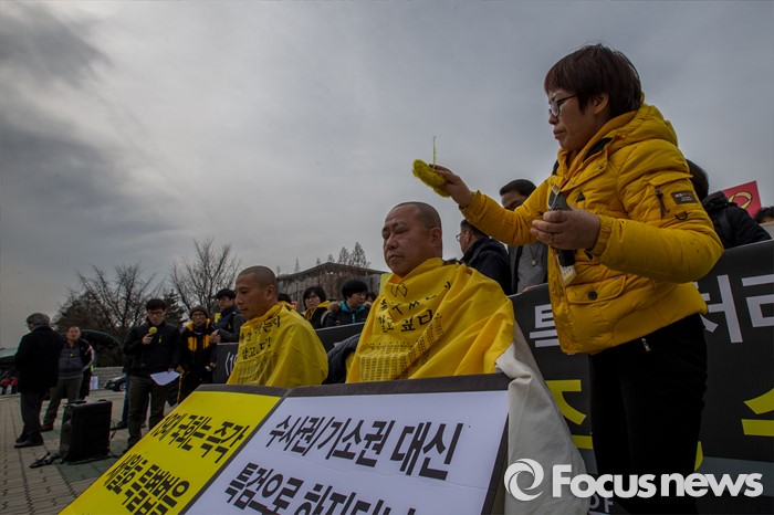(서울=포커스뉴스) 8일 오후 서울 영등포구 국회 앞에서 열린 '19대 국회 세월호 특별법 개정안 특검 처리 촉구 기자회견'에 참석한 4.16가족협의회 관계자들이 정부에 세월호 참사 특검처리 약속 이행을 촉구하며 삭발 하고 있다.