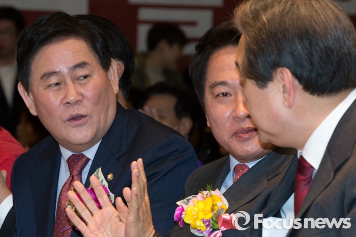 (서울=포커스뉴스) 김무성(오른쪽) 새누리당 대표와 최경환(왼쪽) 새누리당 의원이 8일 오후 서울 마포구 신촌 케이터틀 컨벤션홀에서 열린 새누리당 서울시당 서대문갑 당원교육 및 전진대회에 참석해 대화를 나누고 있다.