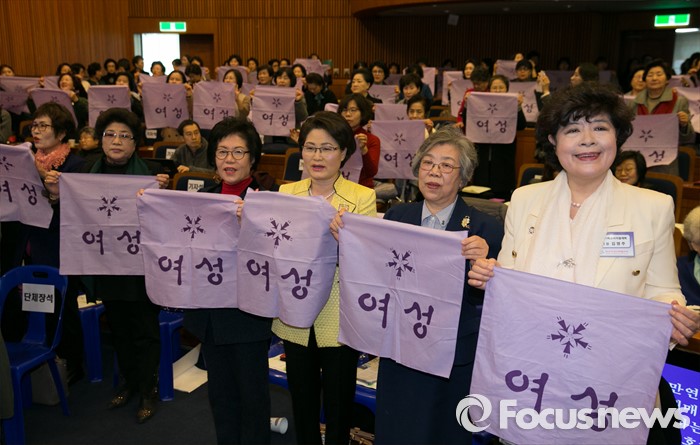 (서울=포커스뉴스) 8일 오후 서울 여의도 국회 헌정기념관에서 열린 세계 여성의 날 기념대회에 참석한 여성들이 퍼포먼스를 하고 있다.