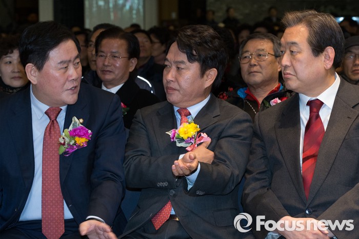 (서울=포커스뉴스) 김무성(오른쪽) 새누리당 대표와 최경환(왼쪽) 새누리당 의원이 8일 오후 서울 마포구 신촌 케이터틀 컨벤션홀에서 열린 새누리당 서울시당 서대문갑 당원교육 및 전진대회에 참석해 대화를 나누고 있다.