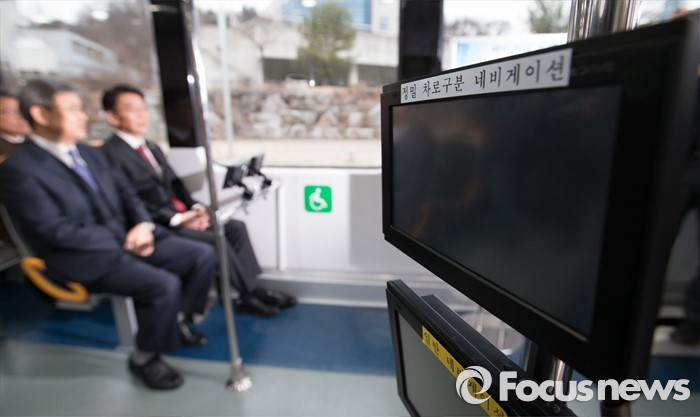 (청주=포커스뉴스) 강호인 국토교통부 장관이 8일 오후 청주시 청원구 오창읍 충북테크노파크에서 열린 차세대 도로교통용 정밀위성항법(GPS) 시연회에서 정밀차로구분 네비게이션이 설치된 바이모달트램을 시승 하고 있다.