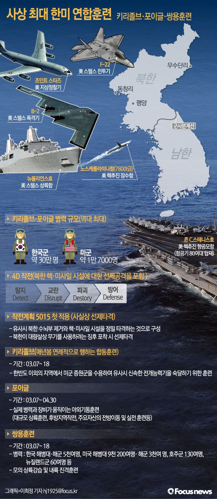 (서울=포커스뉴스) 국방부 관계자는 8일 "한국군 30여만명, 미군 1만7000여명이 참가하는 2016년 키리졸브 및 포이글(독수리) 연습이 어제부터 시작했다"면서 "사상 최대규모인 이번 훈련은 한미연합사령부가 한국 방위를 위해 연례적으로 실시하는 방어적 성격의 연습이다"고 밝혔다.