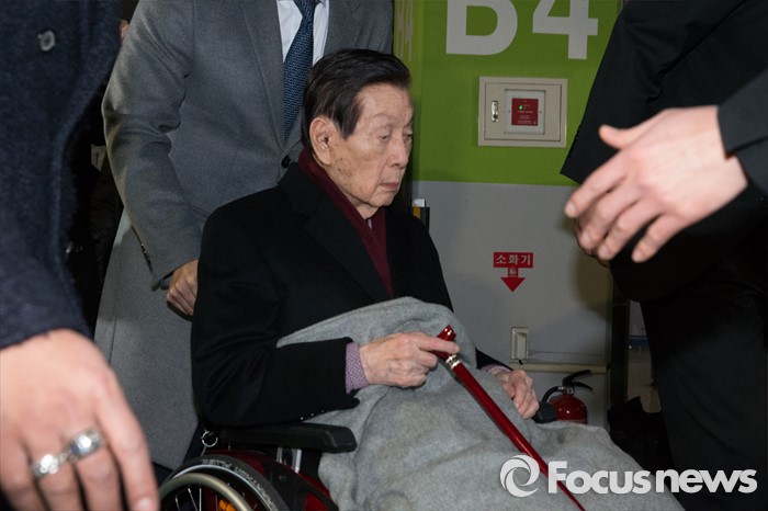 40분 가량의 심리를 받은 뒤 오후 4시 40분 가정법원을 떠나기 위해 지하 4층 주차장에 모습을 드러낸 신 총괄회장은 휠체어에 탑승해 있었다.